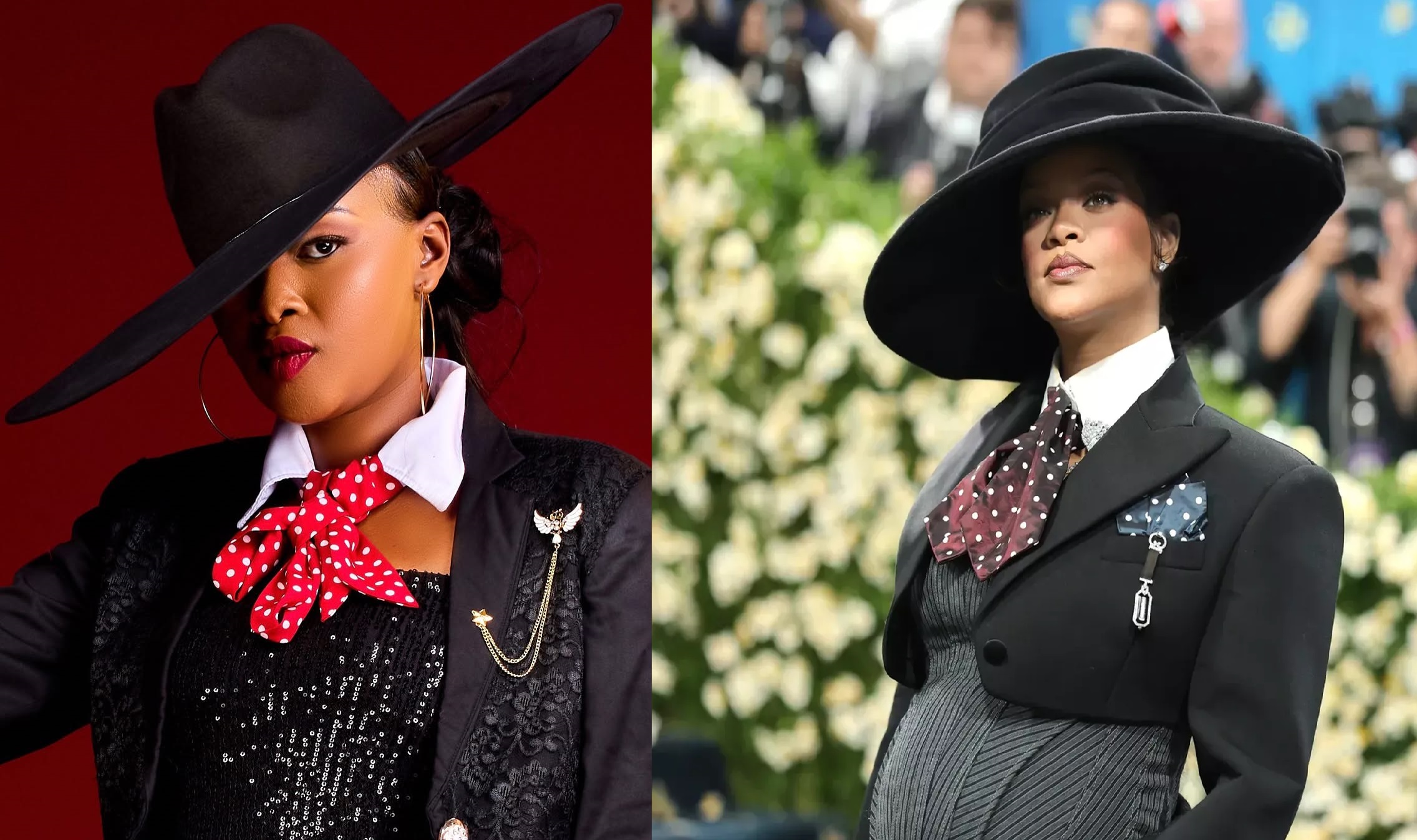 Imyambaro yifotoranyije yambaye isa nkiyo umuhanzikazi wo muri Amerika Rihanna yigeze kugaragaramo mugihe gishize ubwo yari yitabiriye ibirori bya Met Gala 2025.